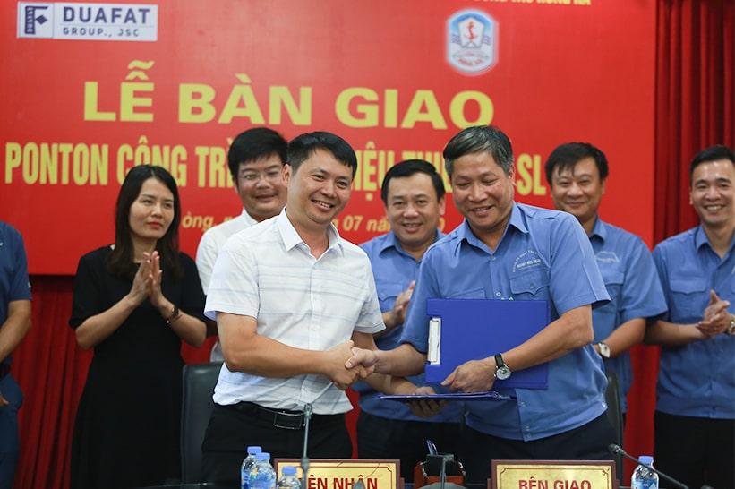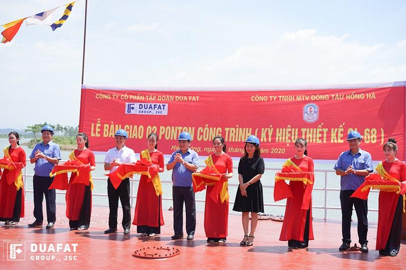 Về phía Công ty TNHH MTV đóng tàu Hồng Hà, ông Nguyễn Hữu Đoan – phó giám đốc công ty cũng đưa ra kết quả nghiệm thu cho thấy hai ponton đảm bảo đúng yêu cầu kĩ thuật và chất lượng, các thông số đạt yêu cầu thiết kế, phù hợp với hồ sơ thiết kế kỹ thuật đã được phê duyệt, đủ điều kiện bàn giao đi vào sử dụng. Ông cũng xin chân thành cảm ơn sự hợp tác của tập đoàn DUAFAT, chúc cho sự hợp tác giữa hai bên ngày càng phát triển hơn nữa.