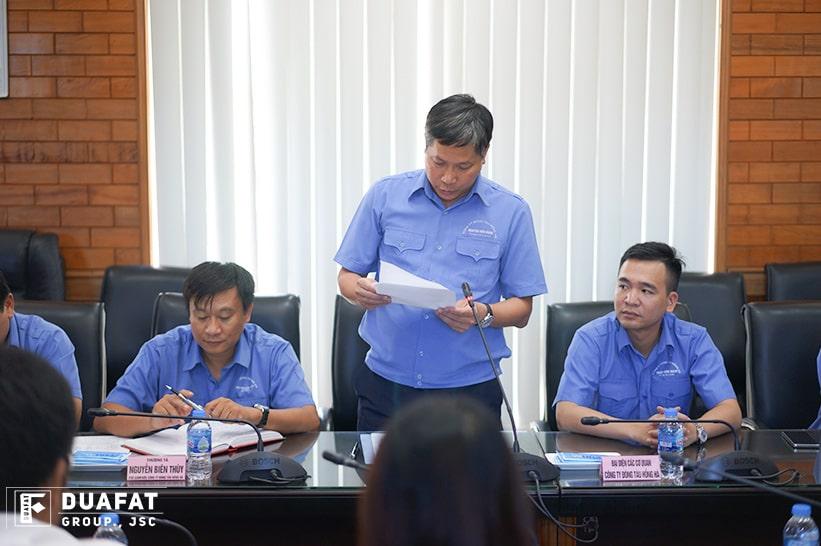 Tại buổi gặp mặt và làm việc tại phòng họp báo, ông Nguyễn Mạnh Toàn – phó tổng giám đốc Công ty cổ phần tập đoàn DUAFAT đã chia sẻ trong quá trình hợp tác và thực hiện hợp đồng, bên phía tập đoàn DUAFAT đã nhận được sự ủng hộ, hỗ trợ rất nhiều từ bên phía Công ty đóng tàu Hồng Hà, nhất là các phòng ban chuyên môn qua việc hai bên đã thường xuyên tương tác trao đổi lẫn nhau. Ông cũng cảm ơn các cán bộ nhân viên bên phía Công ty Hồng Hà đã đồng hành, giúp đỡ để hoàn thiện được hai sản phẩm sà lan ponton, đủ điều kiện đưa vào sử dụng trong thời gian sớm nhất. Ngoài ra ông cũng nhấn mậnh về dự định, mong muốn của phía tập đoàn DUAFAT cũng như theo hợp đồng nguyên tắc giữa hai bên, sẽ cùng hợp tác sản xuất thêm một sà lan với “khủng” kích thước 100x30x6 (m), bổ sung thêm vào trang thiết bị vốn đã rất mạnh về phần thi công trên cạn.